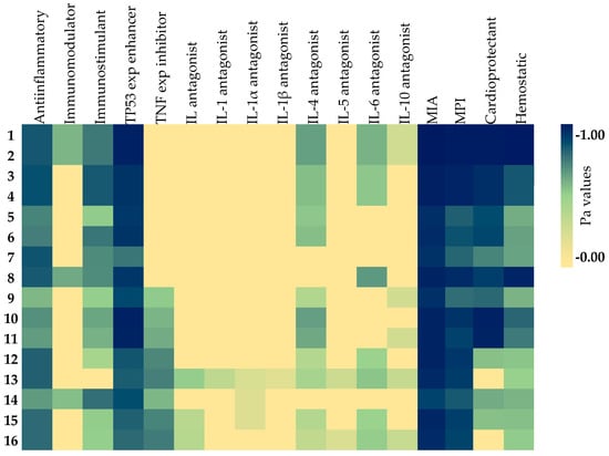 From a broader perspective, in vitro and in silico analysis results suggest that these isolated compounds can attenuate inflammation in blood cell membranes, thereby exerting their anti-inflammatory effects on the cardiovascular system indirectly. The heatmap in Figure 3 shows the predictions of anti-inflammatory and inflammation-related activities generated by in silico models.