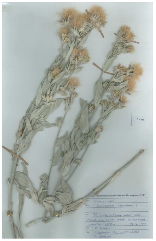 G. tomentosa was collected from Yozgat-Akdağmadeni in July 2013, (N 40°28′13.253″ E 32°39′0.73″). Identification of the plant was carried out by Prof. Hayri Duman from Gazi University, Faculty of Science, Department of Biology as Scorzonera tomentosa L. The voucher specimen (Figure 4) was placed in the Ankara University Faculty of Pharmacy Herbarium (AEF 23841).