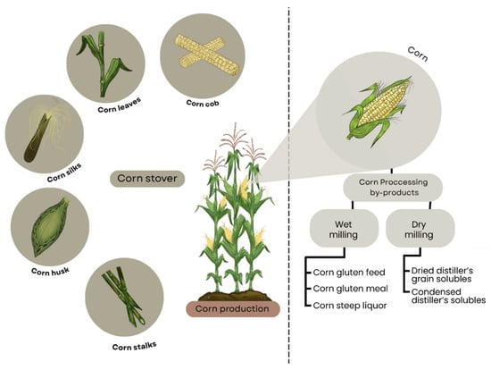 Scheme for corn (Zea mays L.) showing both plant residues (corn stover) and industrial by-products from milling processes (corn processing by-products). Chart adapted from Ruan et al. [7].