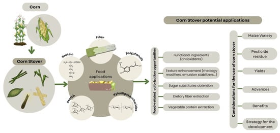 This review, therefore, aims to summarize advances in the characterization and valorization of corn stover for food applications, while also addressing the current lack of studies that integrate its potential to tackle the challenges of developing new food ingredients. Thus, this paper performed an analysis of over 100 articles, including peer-reviewed papers, grey literature, and authoritative reports, with a focus on the valorization of corn stover for food applications (specifically polysaccharides, proteins, and phenolic compounds derived from corn stover). While the primary sources were published between 2003 and 2025, earlier studies were included when they were deemed essential to certain research areas. The selected literature was assessed for its relevance to food security, sustainability, and agricultural practices. The review provides a comprehensive foundation for future research and policy by highlighting a gap in current literature, which tends to focus on biofuels rather than the use of corn stover for food.