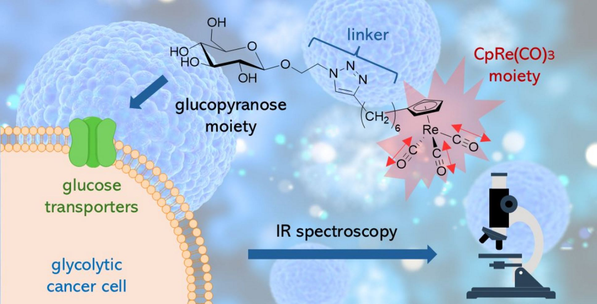 We herein report a specific modification of a β-glucopyranosyl unit leading to the synthesis of a new Cp[Re(CO)3] complex conjugated to the sugar moiety to promote its uptake in cancer cells. Although this approach should currently be limited only to isolated cell cultures or thin tissues, due to the lower penetration depth of infrared signals compared to those emitted by radiopharmaceuticals such as FDG, this complex exhibits strong IR absorption within the minimal IR absorption window of the targeted cells, enabling their visualization through an infrared microscope at a peculiar IR spectroscopy frequency.