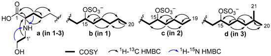 The position of the sulfate group was assigned based on COSY experiments and HMBC correlations (Figure 2, substructure b). The COSY correlations belonging to aliphatic chain revealed the corresponding sequences of protons at C14 to C20. The HMBC cross-peaks H2-17/C-15 and C-19, H2-16/C-18, and H3-20/C-18 clearly indicate the presence of a sulfate group at C-15. The fragmentation in the (–)HRESIMS/MS of 1 (Figure 3, Table S1), particularly the fragment peak at m/z 179, confirmed the location of the sulfate group at C-15.