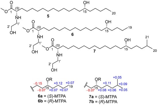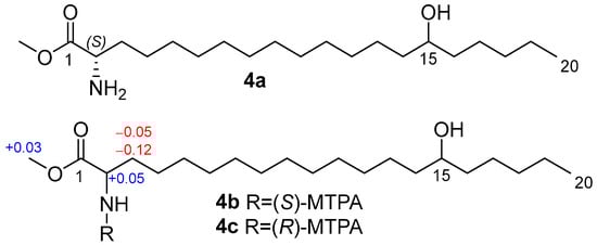 To determine the absolute configuration at C-2, we prepared methyl ester 4a by methanolysis followed by reverse-phase HPLC, then synthesized MTPA amides 4b and 4c and applied the modified Mosher’s method [15]. The observed chemical shift differences ΔδSR (δSδR) for H-2, H-3a, H-3b, and OCH3 between 4b and 4c indicate the 2S configuration (Figure 4).
