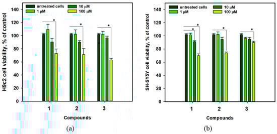 Figure 6. Viability of H9c2 (a) and SH-SY5Y (b) cells treated with anthonoic acids A–C (13) at different concentrations. Data are presented as mean ± standard error of the mean (SEM). The asterisk (*) indicates statistically significant differences between groups (p < 0.05).