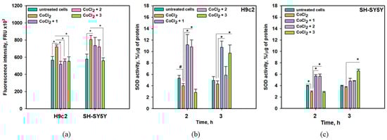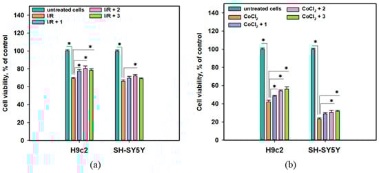 The viability of I/R-treated H9c2 and SH-SY5Y cells decreased by 30.7% and 33.6%, respectively, after 24 h (Figure 7a). Treatment of the cells with CoCl2 at a 500 µM concentration caused a dramatic decrease in the viability of neuronal SH-SY5Y cells after 24 h of exposure by 76.8%, while the viability of cardiomyocytes H9c2 decreased by 58.0% after 48 h of treatment (Figure 7b).