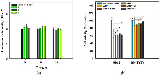 The SH-SY5Y and H9c2 cells were treated with compounds at a concentration of 1 µM for 1 h, and then a dH2O solution of ATP at a concentration of 4 mM was added for 24 h. Brilliant blue G-250 was used as positive control. The viability of the SH-SY5Y and H9c2 cells was measured by an MTT assay as described above.