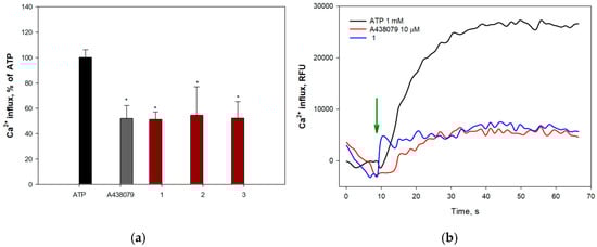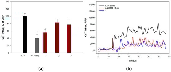 Moreover, compounds 1 and 2 significantly inhibited calcium influx into SH-SY5Y cells, showing efficacy comparable to that of the standard blocker A438079. Compound 2 demonstrated the greatest effect, significantly reducing the influx of calcium ions at a concentration of 10.0 μM by 63.3 ± 8.0%. Treatment of SH-SY5Y cells with compound 1 also led to inhibition of ATP-induced calcium entry (1.0 µM—44.2 ± 8.1%) (Figure 11a).