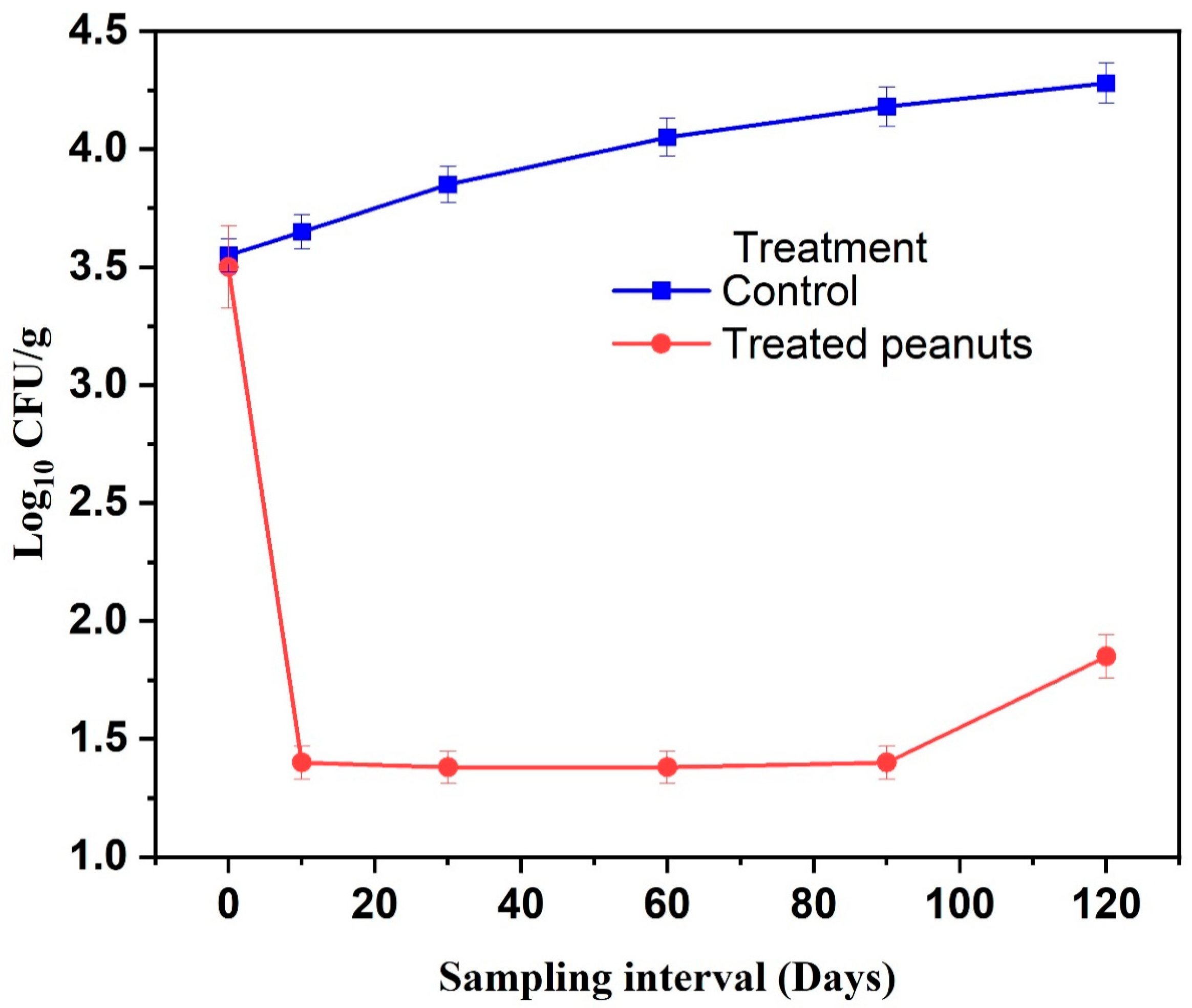| Treated Peanuts (%) | 52 ± 1.2 b | 50.2 ± 1.5 b | 50.5 ± 3.1 c | 49 ± 0.7 a | 50.1 ± 2.2 c |