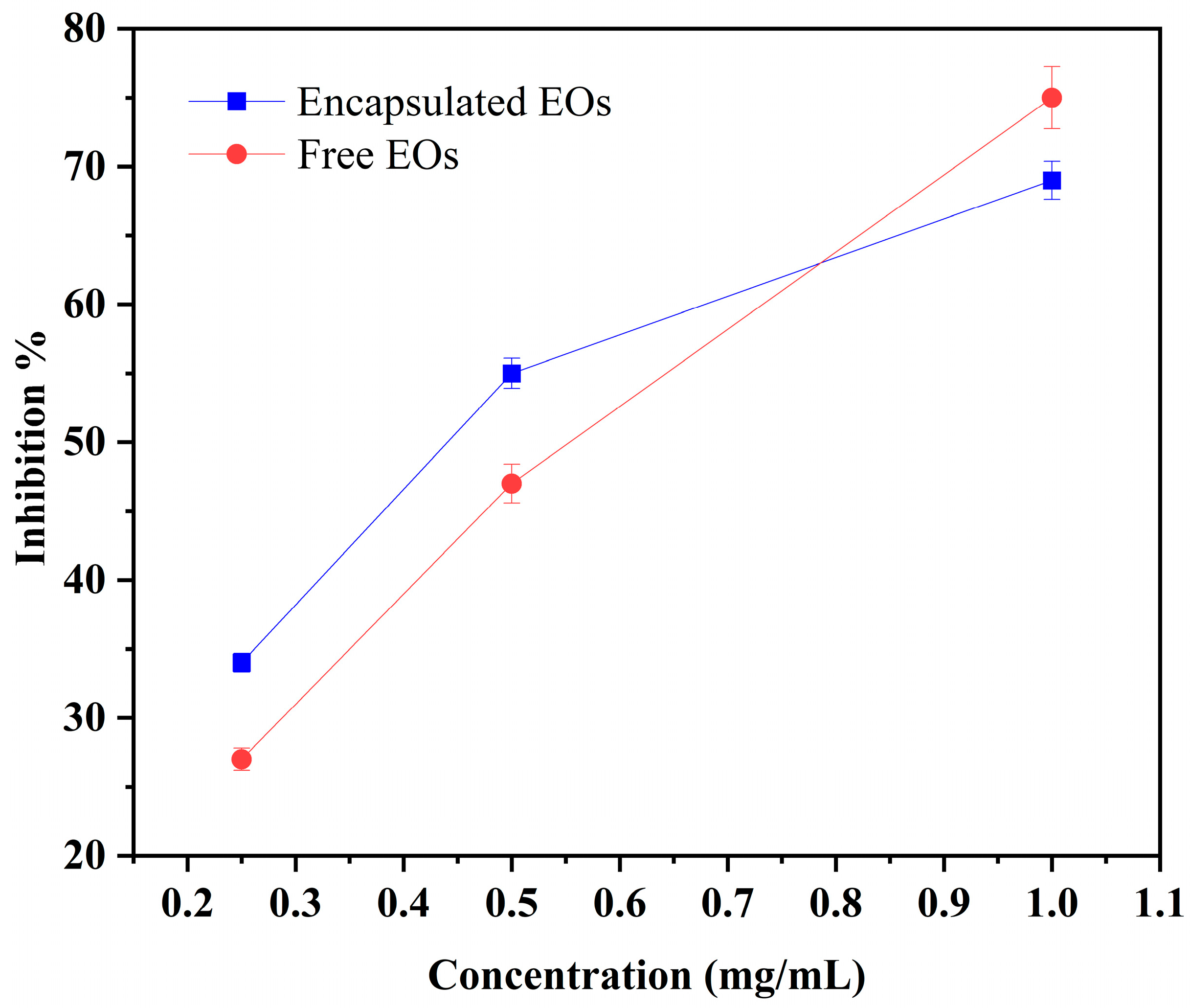 2.5. Antioxidant Activity of Free and Encapsulated Essential Oils