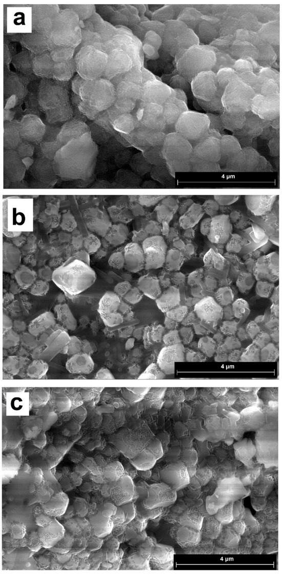SEM images of the synthesized materials: (a)—CaS: Mn; (b)—CaS: Mn/Pb; and (c)—CaS: Pb.