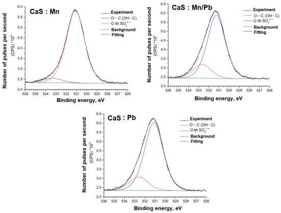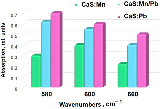 Valence vibrations of sulfides (Figure 3) are located in the low-wavelength range [28], so the 650–680 cm−1 band characterizes Me-S vibrations [29,30]. As manganese ions are replaced by lead ions, an increase in the line intensity is observed (from 0.22 for CaS:Mn and 0.40 for CaS:Mn/Pb to 0.50 for CaS:Pb, Table 1, Figure 4), while a shift of the peak towards shorter wavelengths is noted (from 678 cm−1 for CaS:Mn and 675 cm−1 for CaS:Mn/Pb to 672 cm−1 for CaS:Pb). This effect may be associated with an increase in the polarity of the Me-S bond (Me = Mn, Pb) upon successive substitution of Mn by Pb. The lines 550–600 and 1000–1100 cm−1 can be attributed to vibrations of the S-O group [31,32,33] in sulfates. Lines in the region of 1450 and 3500 cm−1 are attributed [31] to vibrations of O-H groups.