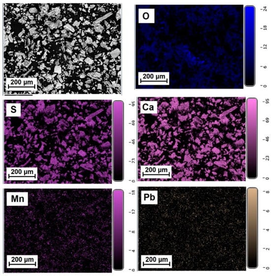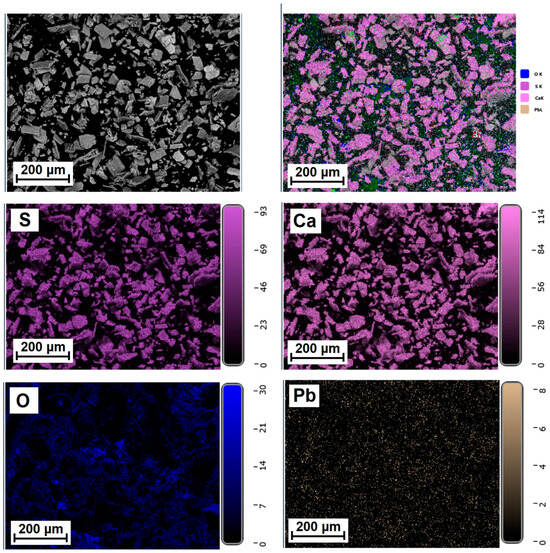 Figure 5, Figure 6 and Figure 7 show the elemental distribution in a reduced phosphogypsum sample based on elemental analysis. The analysis data indicate a uniform distribution of elements throughout the sample, with the exception of oxygen. Areas with higher oxygen content are visible. These data indicate the formation of a composite material whose main phase contains calcium sulfate and calcium sulfide.