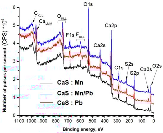 Panoramic XPS spectra of phosphogypsum samples, indicating the lines of detected chemical elements, are shown in Figure 8. We assume that a small amount of fluorine (its lines are present in Figure 8) was added to the sample during sample preparation. Notably, the concentration of doping cations in the surface layers is higher when they are present together in the sample (Table 2).