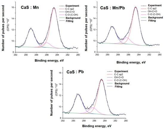 Detailed spectra of the samples and the parameters for their decompositions into components are presented below; the corresponding chemical bonds are indicated (Figure 9, Figure 10, Figure 11, Figure 12, Figure 13 and Figure 14).
