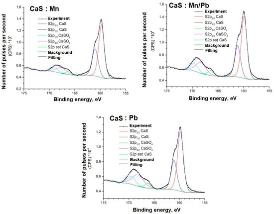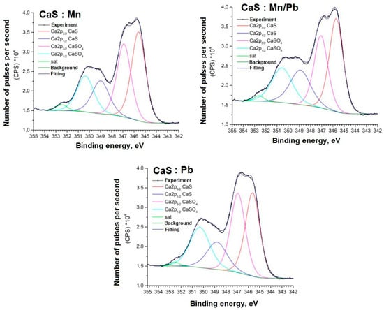 The X-ray diffraction pattern of one of the samples (doped with manganese) is shown in Figure 1. Analysis of the obtained data indicates that calcium sulfate was almost completely converted to sulfide (the CaS/CaSO4 phase ratio can be estimated at 92–93:7–8).