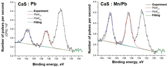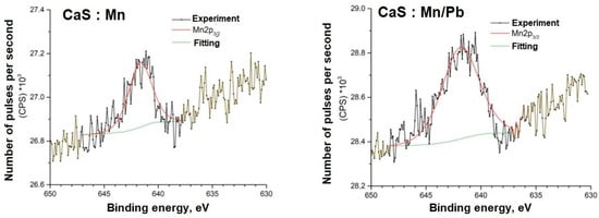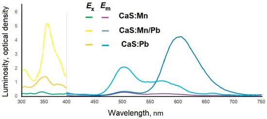 Doping with manganese cations shifted the excitation wavelength to 350 nm; the emission was recorded in the range of 450–680 nm, with peaks at 505, 550, and 670 nm, with a luminescence intensity of 0.3 relative units for CaS:Mn and 2 relative units for CaS:Pb. Joint doping with manganese and lead cations resulted in a significant (3–20 times compared to CaS:Mn (intensity 0.15 relative units) and CaS:Pb (intensity 1.0 relative units) CaS:Mn/Pb (intensity 3.1 relative units)) increase in the luminescence intensity and a shift of the luminescence peak to the red region (625 nm) (Figure 15).