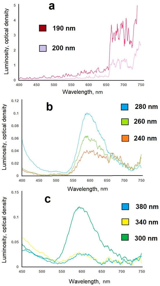 Excitation and luminescence spectra were recorded using an SM 2203Z Spectrofluorometer (JSC Spectroscopy, Optics and Lasers—Avant-garde Developments, Minsk, Belarus) in the excitation wavelength range of 190–380 nm and emission wavelength range of 400–750 nm.