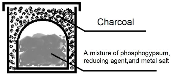 A solution of manganese(II) (6 mL) (or lead(II) (30 mL)) salt was added to 17.2 g of phosphogypsum, and the mixture was dried to constant weight at 100 °C (for approximately 2 h). When a sample containing both doping cations was prepared, the manganese cation (4 mL) was added first and dried, then the lead cation (30 mL) was added, and the sample was dried again; 7 g of starch was added to the samples and thoroughly ground in a mortar until a homogeneous mixture was formed.