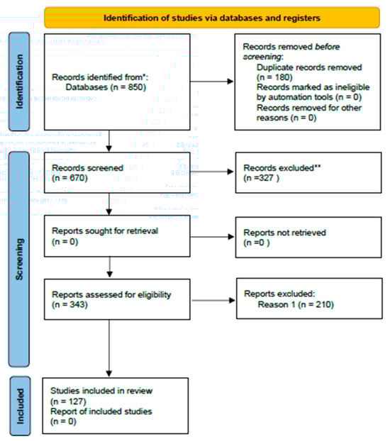 The Systematic Review follows the general approach of PRISMA 2020 statement. The full text of references identified as potentially relevant was obtained, and papers were included by applying the inclusion criteria. The number of documents retrieved was 850. Of those, 180 were duplicates and were removed, and 343 papers were excluded based on the criteria used. The number of studies finally included in this systematic review was 127 (Figure 1).