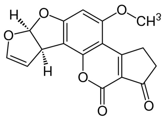 Aflatoxins are a group of structurally related difuranocoumarin compounds (Figure 2) produced primarily by Aspergillus flavus, Aspergillus parasiticus, and Aspergillus nomius [30]. These toxins are found worldwide, but they are produced more frequently in warm, tropical, or subtropical climates.