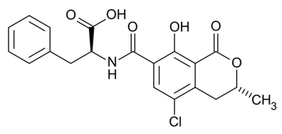 Ochratoxins (OT) are phenylalanine-dihydroisocoumarin compounds (Figure 3) produced primarily by Aspergillus spp. and some Penicillium spp., including A. ochraceus, A. carbonarius, A. alliaceus, A. auricomus, A. niger, A. melleus, A. glaucus, P. verrucosum and P. nordicum [49]. OT toxins are usually produced when stored, contamination of grains before harvest is also possible [50]. Ochratoxins are present in the seeds of many plants and food products. They have been detected in rye, wheat, barley, corn, sorghum, millet, rice and oilseeds (Table 2) [49,51]. The most common forms of OT are ochratoxins A (OTA), B (OTB) and C (OTC), which differ in chemical structure and toxicity. OTB is the non-chlorinated form of OTA, while OTC is the ethyl ester of OTA formed in the presence of ruminal fluid [49,50]. OTA is the most prevalent and toxic form of ochratoxin, whereas OTB exhibits the lowest degree of toxicity [49]. Ochratoxins exhibit immunosuppressive and nephrotoxic effects. Due to their potentially carcinogenic properties, the IARC has classified OTA as a group 2B agent, that is, a possible carcinogenic agent [31]. In addition, ochratoxins inhibit protein synthesis and affect the activity of humoral immune factors, particularly immunoglobulins, as well as lead to a reduction in NK cell activity. Ochratoxins may also induce oxidative stress [50]. Regarding the chemical structure of ochratoxins, each of them contains a nonpolar end and several polar groups in the side chain (Figure 3). They can bind to lipids and proteins, such as plasma albumin [52]. Analogously to aflatoxins, ruminants exhibit definitely lower sensitivity to OTA compared to monogastric animals. Rumen microorganisms, primarily protozoa, convert OTA into non-toxic OT. This process affects the half-life of OTA, which ranges from 0.6 to 3.8 h. After 10 to 24 h, the mycotoxin is completely metabolized [53]. It is significant to note that high-protein feed reduces the detoxification rate of OTA in both calves and adult individuals. Most OTA is eliminated in the urine. OTA residues have not been detected in meat and other animal tissues from cattle. However, OTA is found in the tissues of pigs (mainly the kidneys) and poultry. OTA residues detected in milk are at low levels [54,55,56] and only in situations of chronic exposure of cattle to this type of toxin. After a single exposure to a high dose of ochratoxin A (13 g/kg body weight), diarrhea, coordination disturbances, anorexia, and decreased milk production were observed. All of these symptoms were temporary [55,57]. It should be mentioned that the toxic effect of ochratoxin occurs in the case of chronic exposure to low doses, as evidenced by clinical cases reports of poisoning in cattle.