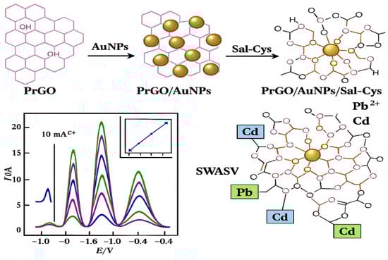 Schematic illustration of the interaction between Cd2+ and Pb2+ with the surface of the PrGO/AuNPs/Sal-Cys/GCE [64].