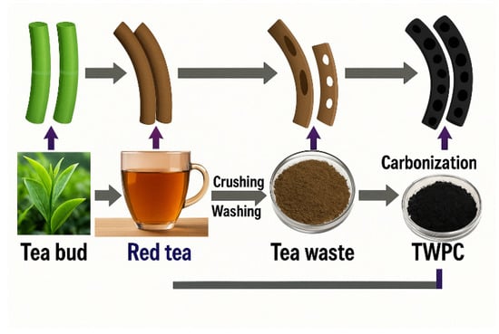 The use of biomass materials not only helps to effectively address the complex production process of traditional carbon materials but also reduces waste, which holds significant practical importance for energy conservation, emission reduction, and environmental protection. Biomaterials are mainly converted into porous carbon materials through a combination of carbonization and chemical activation. Impurities in the biomolecular framework can be removed from the biomass through high-temperature carbonization in an inert gas atmosphere, resulting in the formation of a porous carbon skeleton [72,73]. Due to the wide variety of biomass sources, diverse biomaterials such as persimmon branches [74], tea waste [75], corn cobs [76], cork oak [77], eggplants [78], palm shells [79], etc., can be used to prepare biomass-based porous carbon materials. Figure 4 shows a carbon-based biomaterial synthesized from tea waste using a simple method that combines carbonization and activation [80]. Zhang et al. [81] reported a biomass-derived porous carbon prepared from grapefruit peel, which showed excellent electrochemical performance for the detection of Pb2+, Cd2+, and Cu2+ using SWASV. The sensor exhibited high sensitivity, good repeatability, and low detection limits. These results indicate that biomass-based carbon materials are promising sustainable alternatives for electrochemical heavy metal detection.