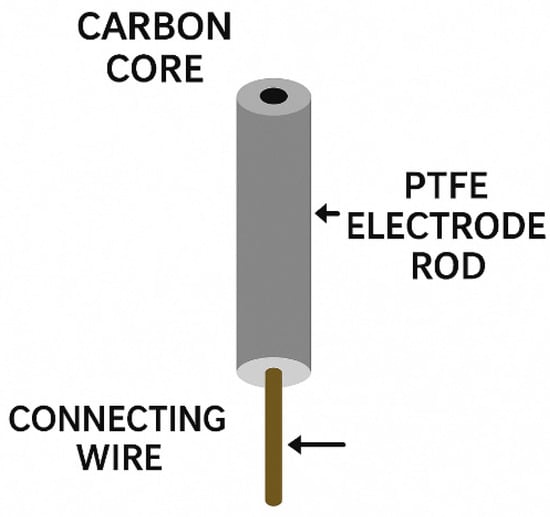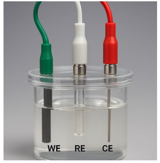 A three-electrode electrochemical system was used in the experiment. The three-electrode system is the most commonly used setup in electrochemistry. Its configuration is shown in Figure 6 and includes a working electrode, a reference electrode, and a counter electrode. In this experiment, a glassy carbon electrode (GCE) was used as the working electrode, a silver/silver chloride (Ag/AgCl) electrode served as the reference electrode, and a platinum wire was used as the counter electrode. The three electrodes were connected to the corresponding terminals of the electrochemical workstation. Using differential pulse voltammetry (DPV), Pb2+ and Cd2+ ions in the aqueous phase, composed of a supporting electrolyte solution, were detected.