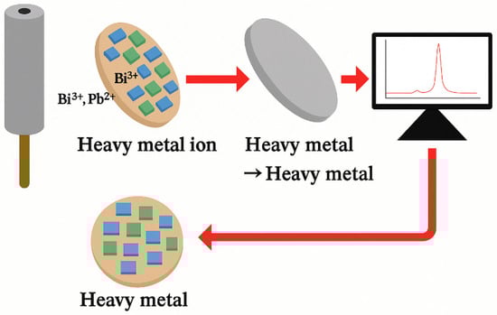 During anodic stripping voltammetry (ASV), the electrochemical sensing process consists of two main steps: (i) a deposition step, in which metal ions are electrochemically reduced and accumulated in their metallic state on the electrode surface; and (ii) a stripping step, in which the deposited metals are re-oxidized, producing well-defined current peaks that are directly proportional to the metal ion concentration. This preconcentration–stripping mechanism leads to significant signal amplification and enables ultra-trace detection of heavy metal ions. The π-electron-conjugated structure of carbon nanotubes and graphene facilitates rapid electron transfer across the electrode surface, significantly reducing charge-transfer resistance. In addition, the large specific surface area and abundant defect sites provide numerous active adsorption centers, thereby enhancing both sensitivity and detection stability. When bismuth or antimony films are introduced, intermetallic alloy formation improves nucleation efficiency and suppresses hydrogen evolution, resulting in higher signal-to-noise ratios and improved analytical performance.