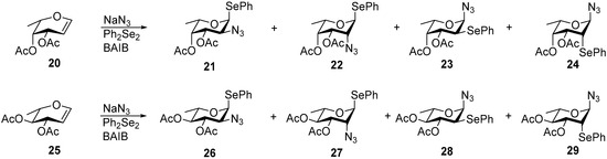 When the reaction was conducted in MeCN on a 2.5 mmol scale, the combined yield of the mixture increased to 91%, and the yield of 2-azidofucoside 21 improved markedly to 79%, albeit with a slight decrease in stereoselectivity (Table 4, Entry 2). Although at this stage, pure product 21 could not be isolated, it is known that Zemplén O-deacetylation allows further separation of phenyl 2-azido-2-deoxy-1-phenylseleno-α-l-fucoside by simple crystallization [30].