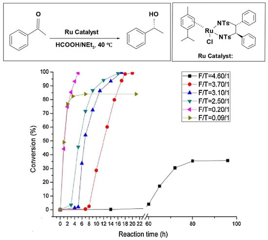 For the Ru–TsDPEN system specifically, Zhou et al. showed that intermediate F/T ratios (e.g., 0.20–0.25/1) enable rapid Ru–H formation, eliminate the induction period, and deliver full conversion within a few hours with consistently high enantioselectivity (ee ≈ 97%) (