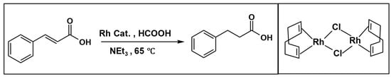 In addition to the commonly studied inorganic bases, organic amines have proven to be key additives in facilitating hydrogenation reactions of unsaturated compounds, including alkenes and carbonyls. In our previous work on the rhodium-catalyzed hydrogenation of cinnamic acid, triethylamine was essential for high reactivity, providing a 95% yield, whereas KOH afforded only 4%. This difference can be attributed to the nature of the bases: KOH, a strong Brønsted base, is poorly soluble and may disrupt the coordination sphere of the rhodium dimer or promote catalyst deactivation. In contrast, triethylamine, a weaker Brønsted base and moderate Lewis base, is sterically compatible, fully soluble, and maintains a homogeneous environment that supports catalyst activation and turnover (