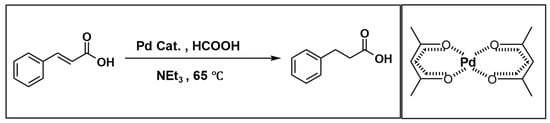 Scheme 6), the catalytic performance correlates strongly with the basicity of the additive. Triethylamine provided a high yield (95%), consistent with its moderate basic strength, which is sufficient to promote formate deprotonation and generate the active Pd–H species required for cinnamic acid reduction. Additionally, triethylamine can partially deprotonate cinnamic acid, increasing its reactivity toward hydride transfer. KOH, being a much stronger base, also delivered a high yield (87%), in line with its ability to accelerate hydride formation through rapid formate activation. In contrast, Na