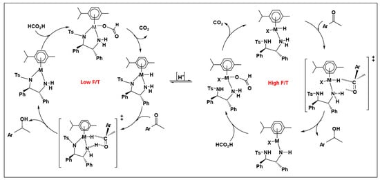 52]. These parallel trends underscore that sensitivity to the F/T ratio is a general characteristic of ATH systems employing formic acid–amine mixtures.
