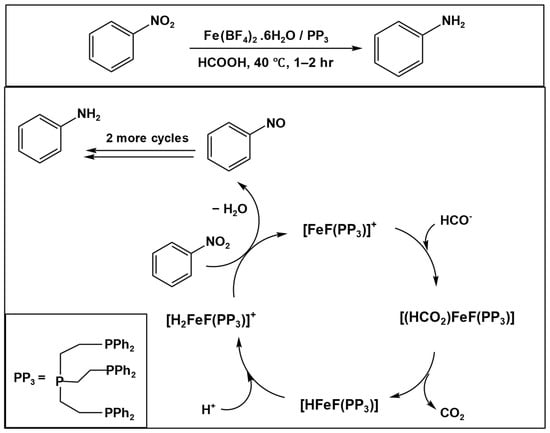 2 and produce an iron dihydride intermediate. Crucially, this hydride species is generated without prior deprotonation by base, distinguishing the mechanism from classical formate–base systems. The resulting Fe–H species sequentially reduces nitrobenzene through nitroso and hydroxylamine intermediates—none of which accumulate, consistent with rapid, base-independent turnover.