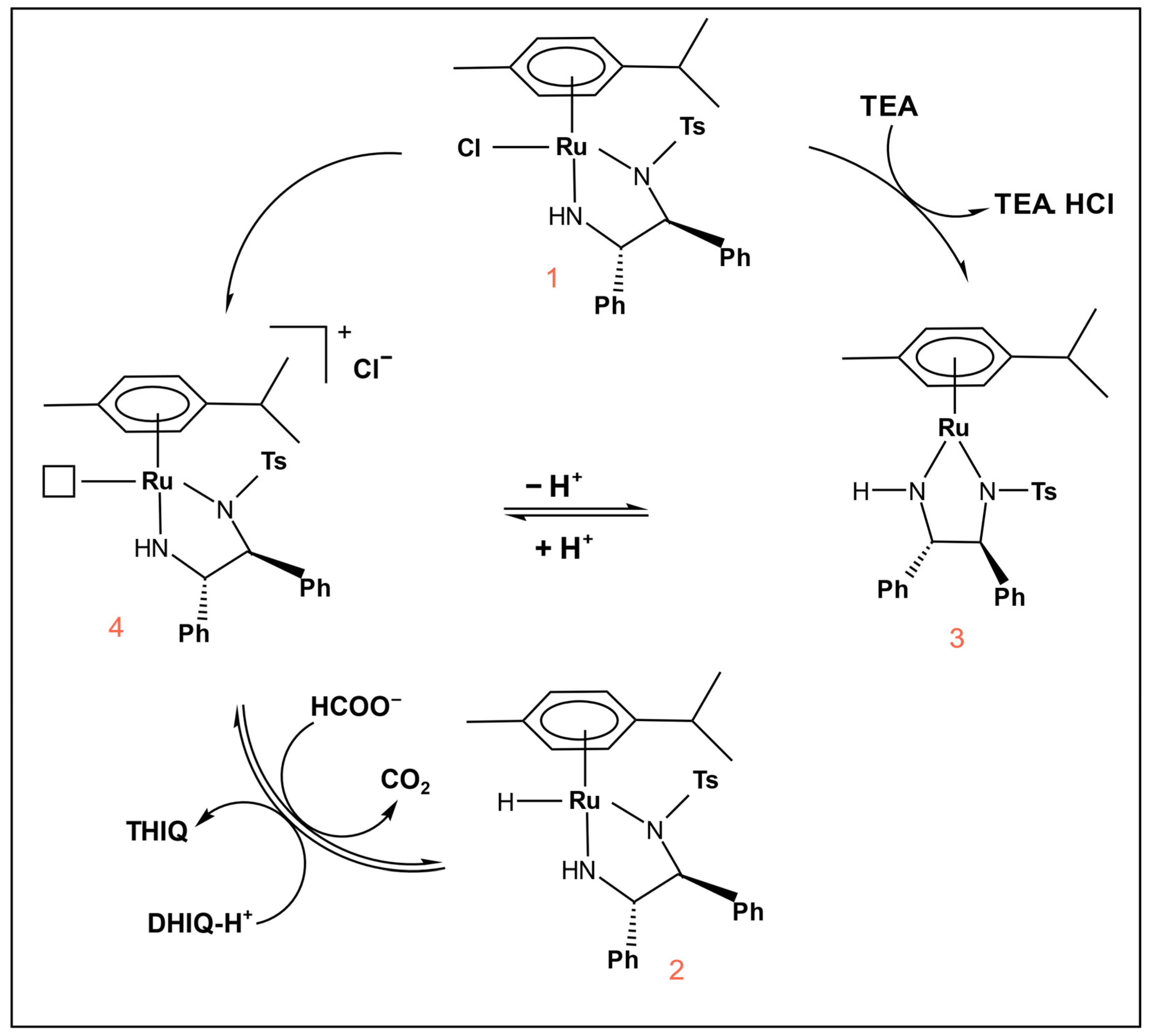 A mechanism commonly reported in the literature describes how asymmetric transfer hydrogenation (ATH) with transition metal complexes proceeds through base-assisted catalyst activation and hydride formation [