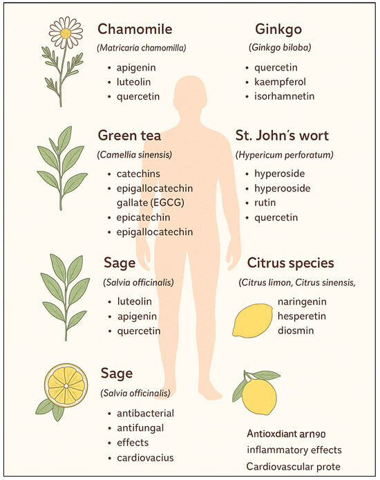 Phytochemical studies indicate that a high level of flavonoids correlates with antioxidant activity and the potential pharmacological properties of herbal raw materials. Numerous flavonoids are commonly identified in medicinal plants, including quercetin, which occurs, among others, in stinging nettle leaves (Urtica dioica) and hawthorn flowers (Crataegus spp.). Other important representatives of this group include luteolin and apigenin, which are abundantly present in vervain (Verbena officinalis) and German chamomile (Matricaria chamomilla). Chinese tea (Camellia sinensis L.) is a natural source of catechin. Moreover, many herbal materials, such as ginkgo (Ginkgo biloba), contain flavonol glycosides, including rutin and isoquercitrin, which are characterized by high antioxidant activity [3] (Figure 1).