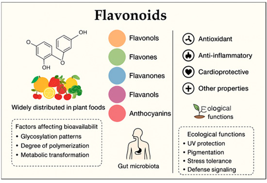 The structural heterogeneity of flavonoids strongly determines their bioactivity and pharmacokinetics. The bioavailability of dietary flavonoids shows substantial variability, arising from differences in conjugation, polarity, and interactions with the gut microbiota [19].