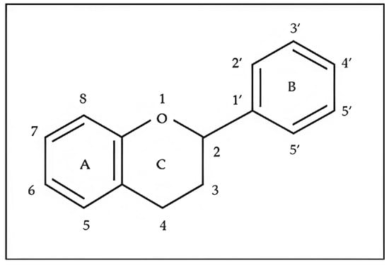 The basic flavonoid skeleton consists of 15 carbon atoms arranged in a flavan framework (C6–C3–C6), composed of two benzene rings (A and B) linked by a heterocyclic pyran or pyrone ring (C) (Figure 3).