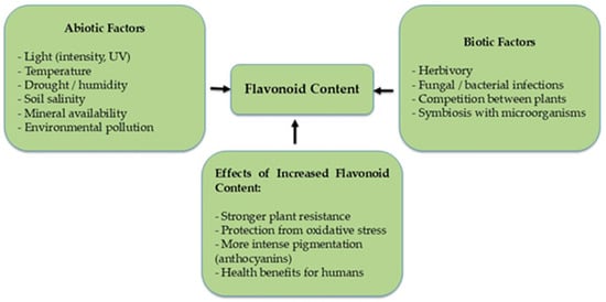 Influence of biotic and abiotic factors on flavonoid content in plant.