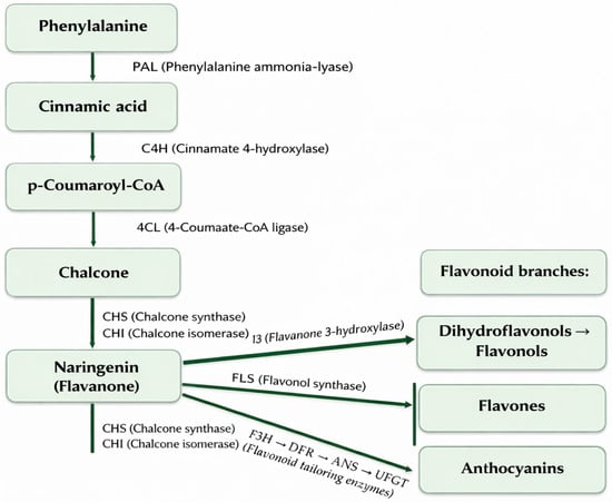 The shikimate pathway leads to the formation of aromatic amino acids such as phenylalanine, a crucial precursor for flavonoid biosynthesis. Phenylalanine undergoes deamination catalyzed by phenylalanine ammonia-lyase (PAL), forming cinnamic acid, which is subsequently hydroxylated by cinnamate 4-hydroxylase (C4H) to p-coumaric acid. Activation of this compound yields p-coumaroyl-CoA, which then condenses with three malonyl-CoA units in a reaction catalyzed by chalcone synthase (CHS). This process produces a compound with the characteristic C6–C3–C6 flavonoid skeleton. Chalcone is then isomerized by chalcone isomerase (CHI) to form a flavanone, which serves as the central intermediate for subsequent modifications—including hydroxylation, methylation, and glycosylation—ultimately generating diverse flavonoid classes such as flavonols, isoflavones, and anthocyanins (Figure 5) [47,49].