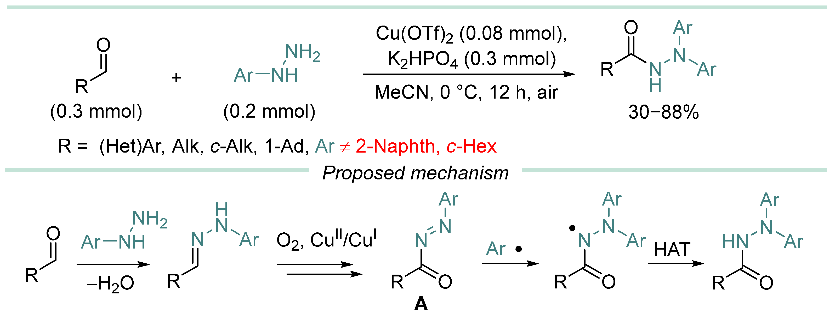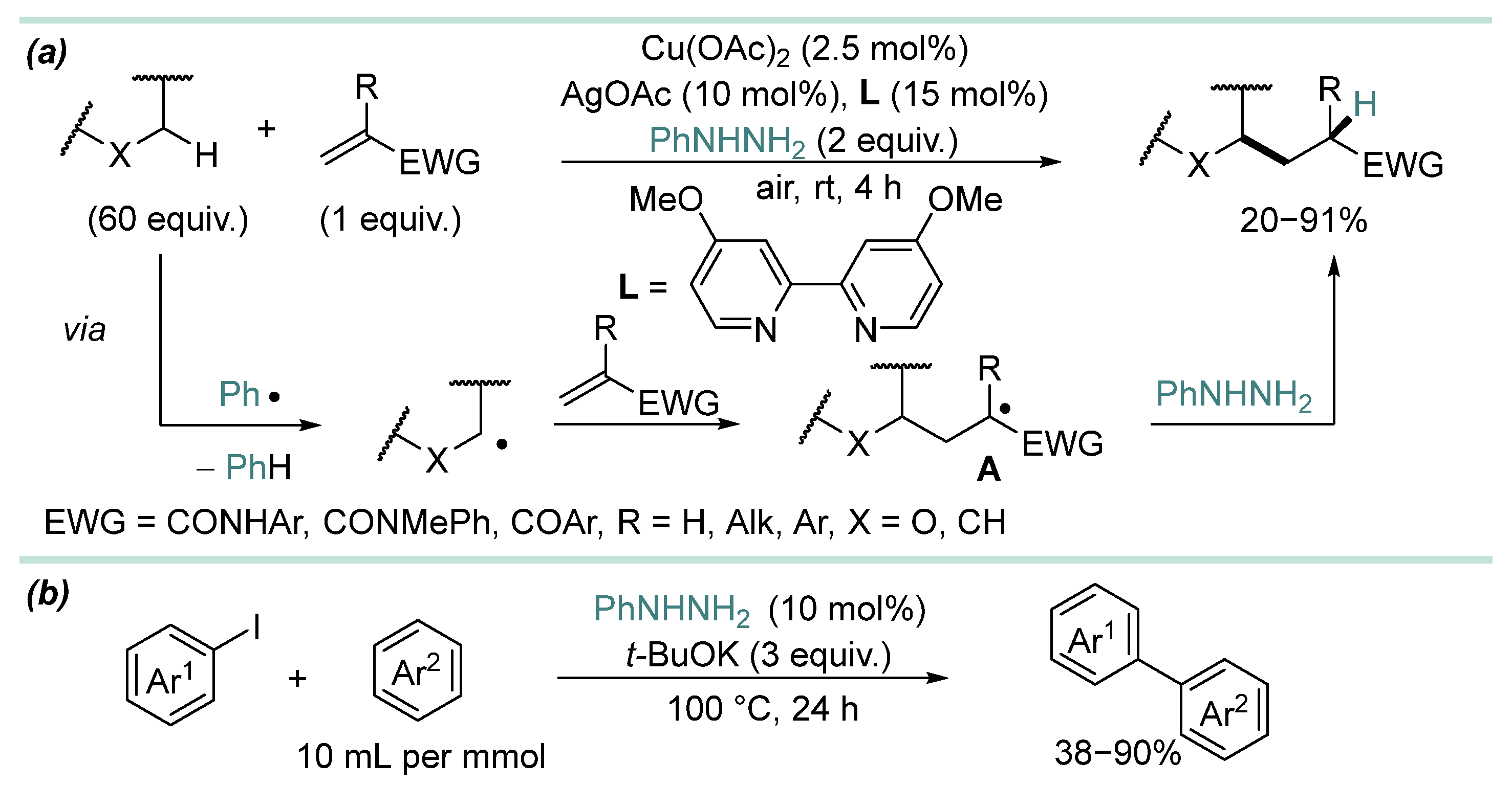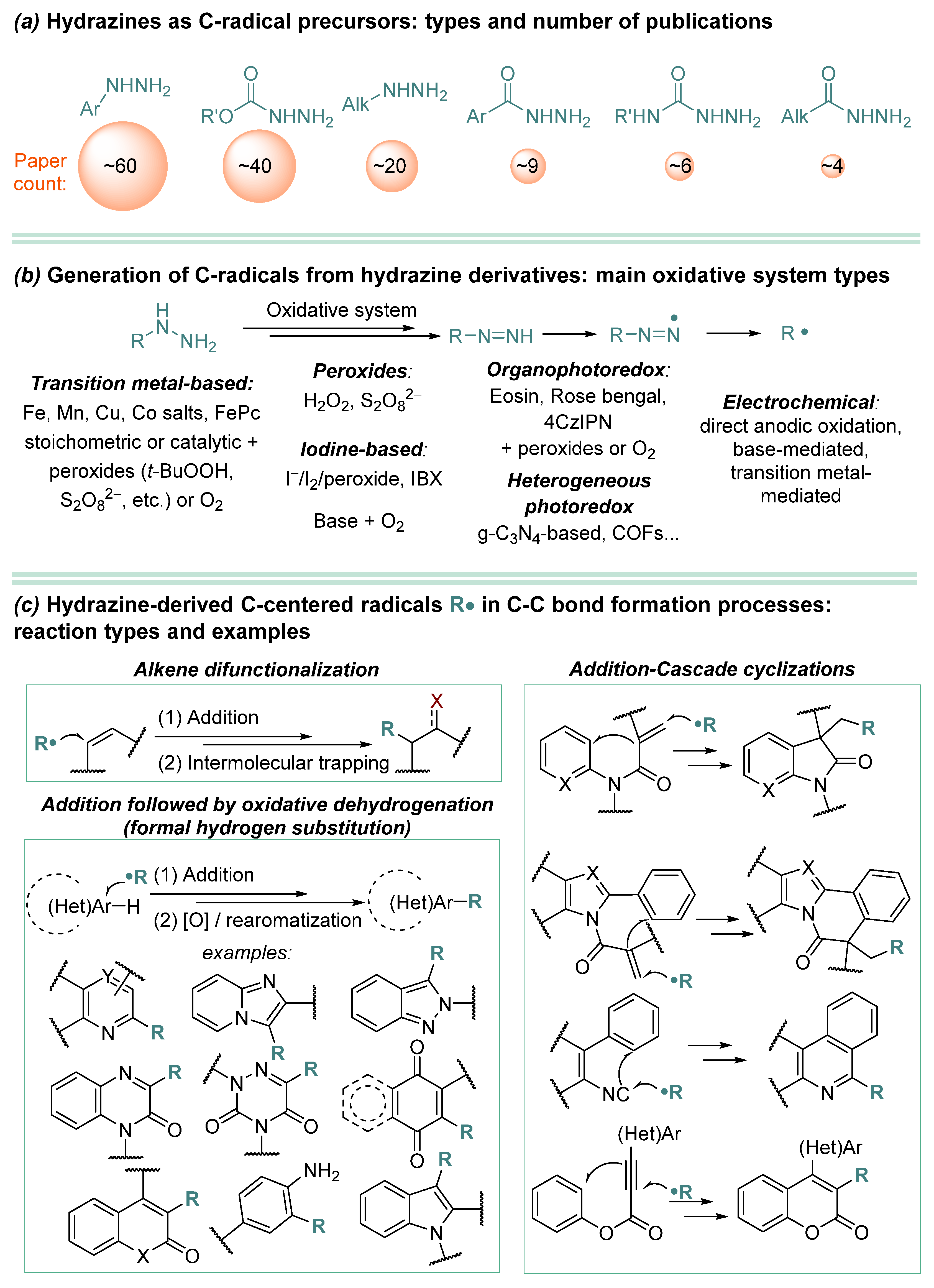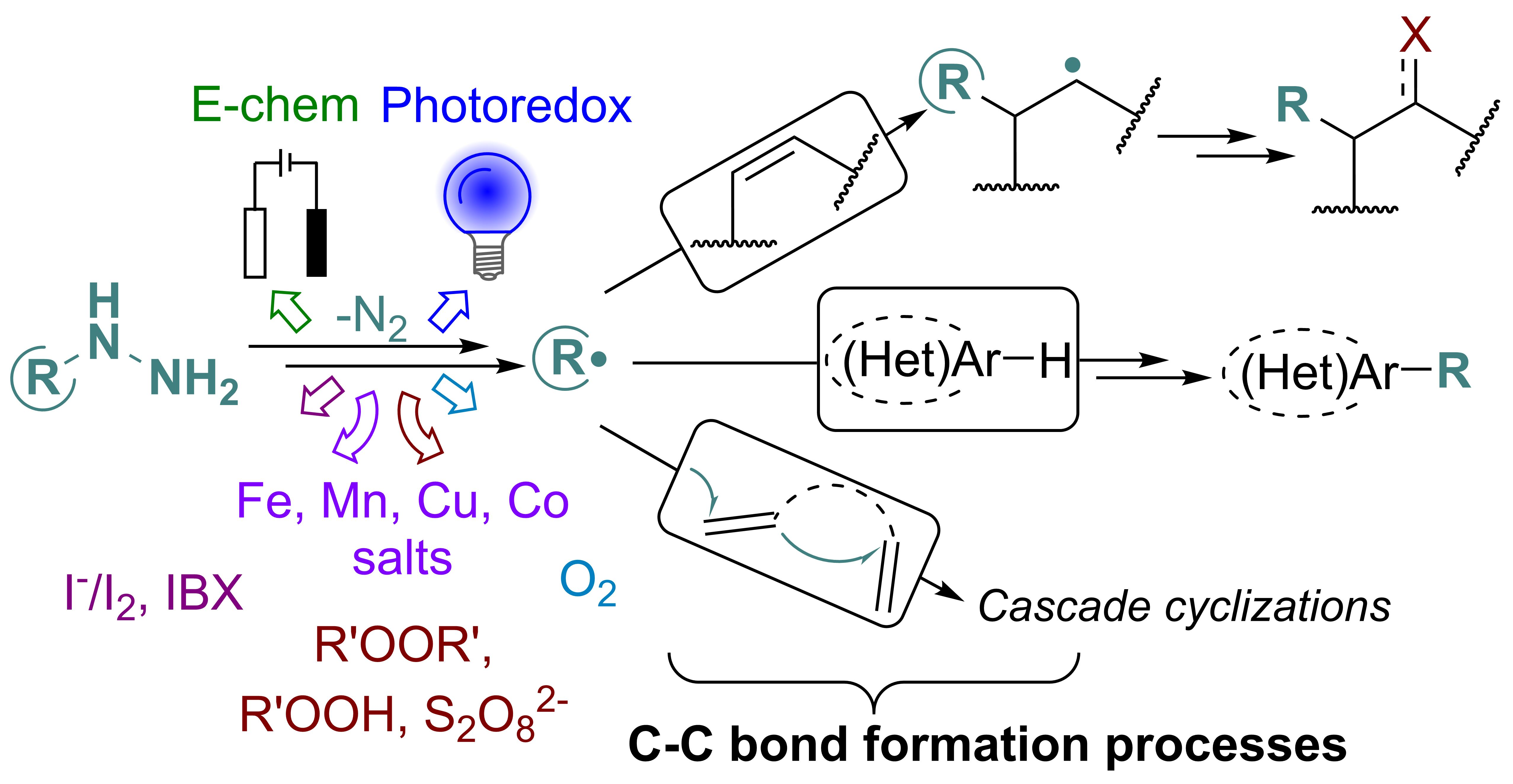 - In most cases, hydrazine derivative is used in excess amounts, in some cases, C-radical acceptor is used in excess, but there are almost no effective examples of C-C coupling with 1:1 substrate/hydrazine ratio, which is a serious limitation when two complex and valuable reagents are to be coupled.