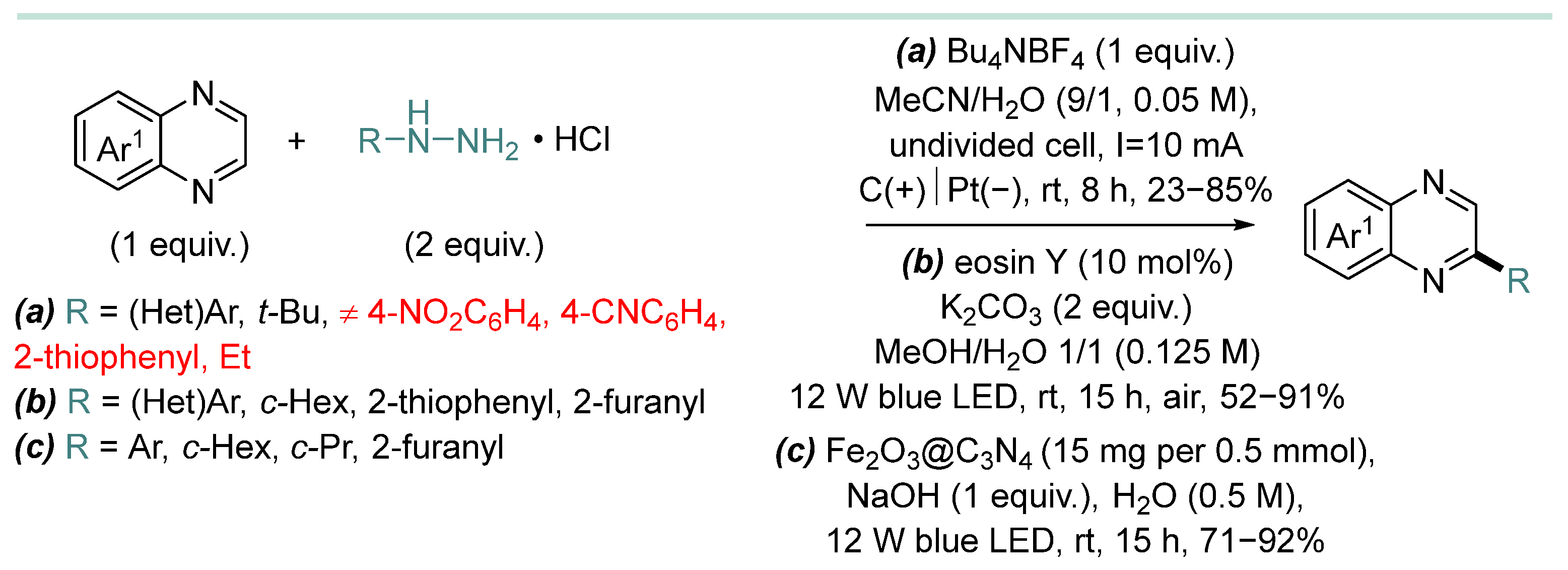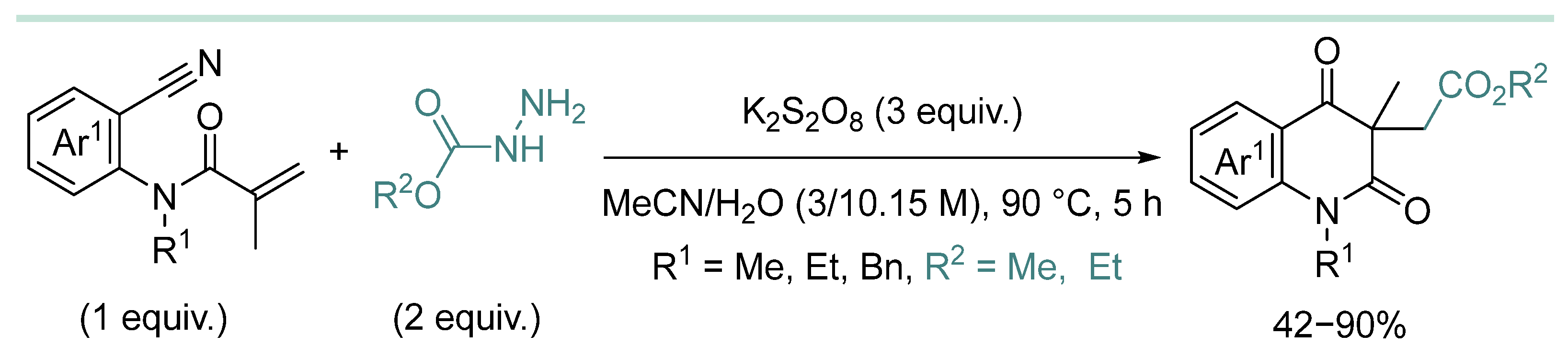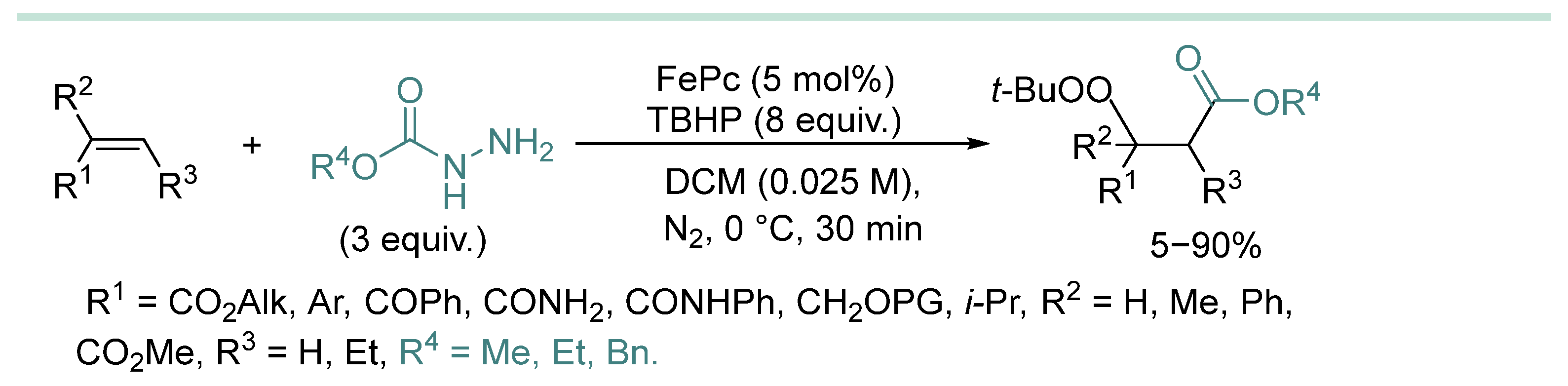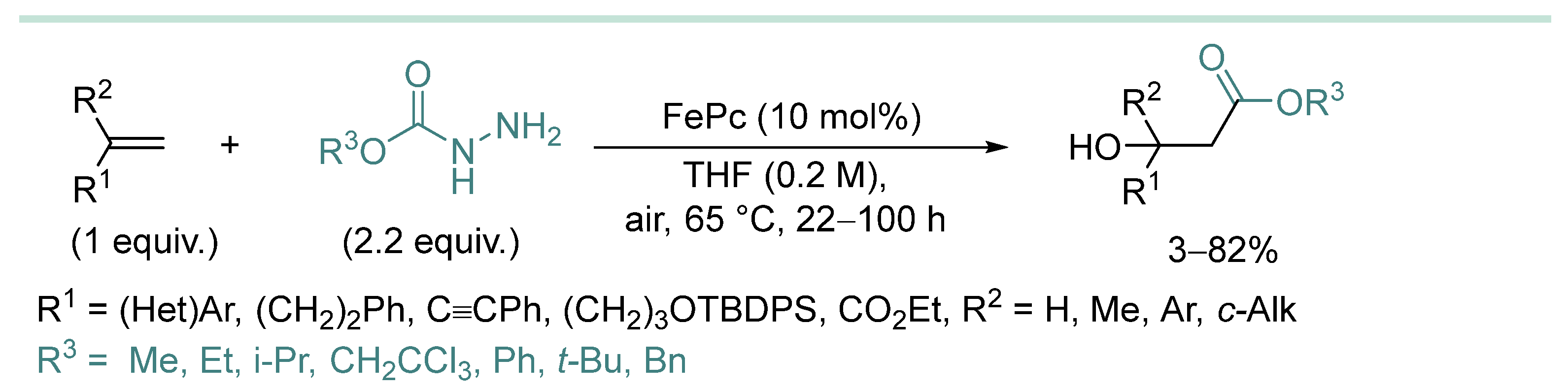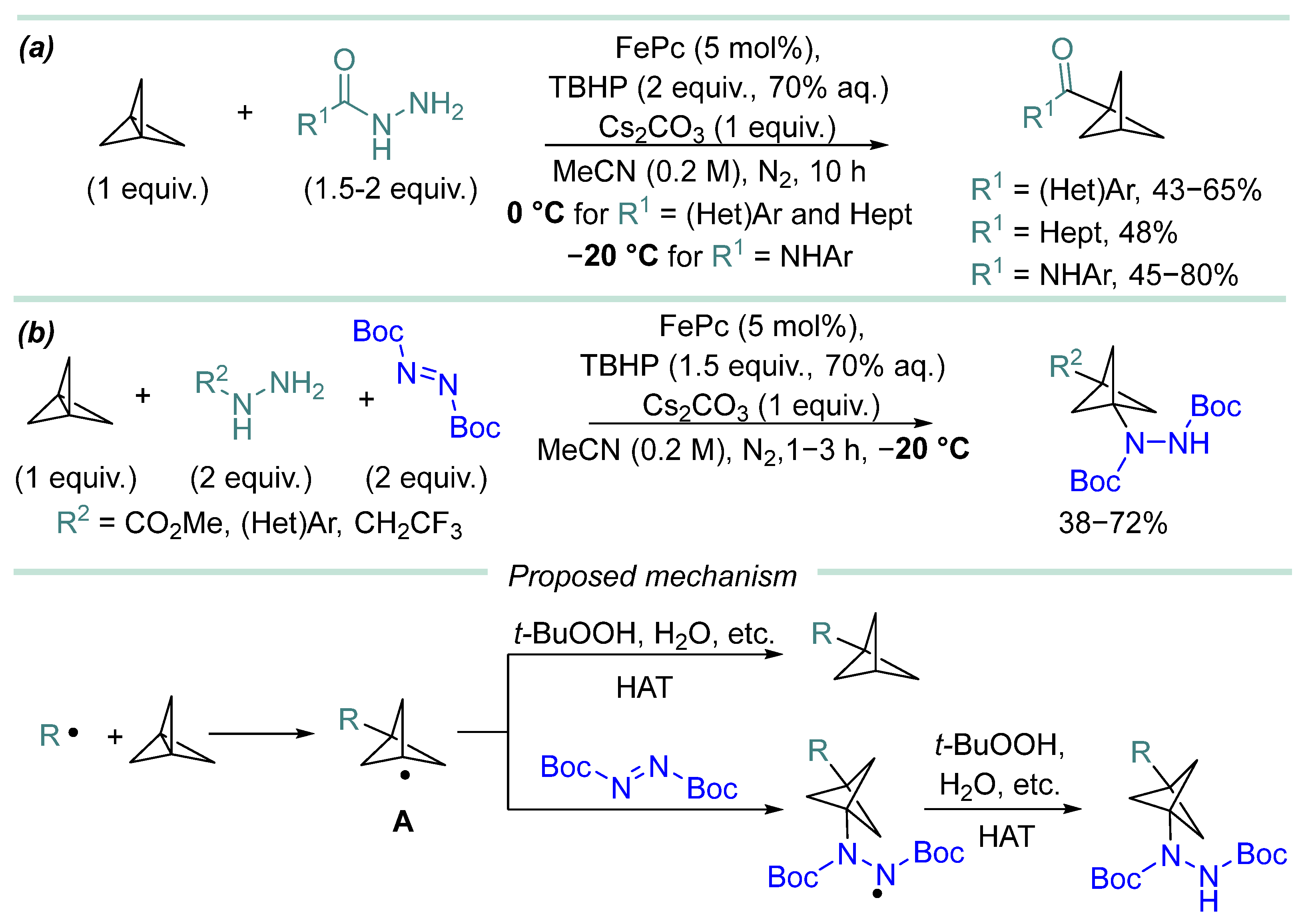 - In most cases, hydrazine derivative is used in excess amounts, in some cases, C-radical acceptor is used in excess, but there are almost no effective examples of C-C coupling with 1:1 substrate/hydrazine ratio, which is a serious limitation when two complex and valuable reagents are to be coupled.
