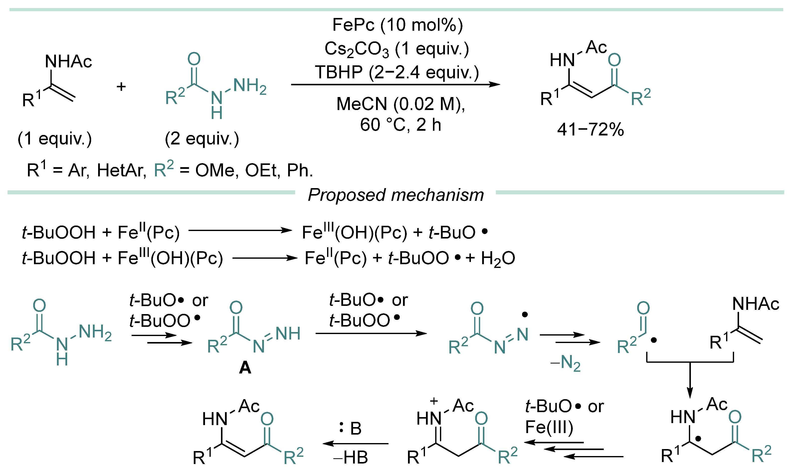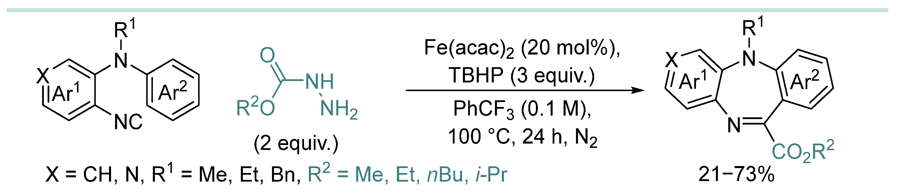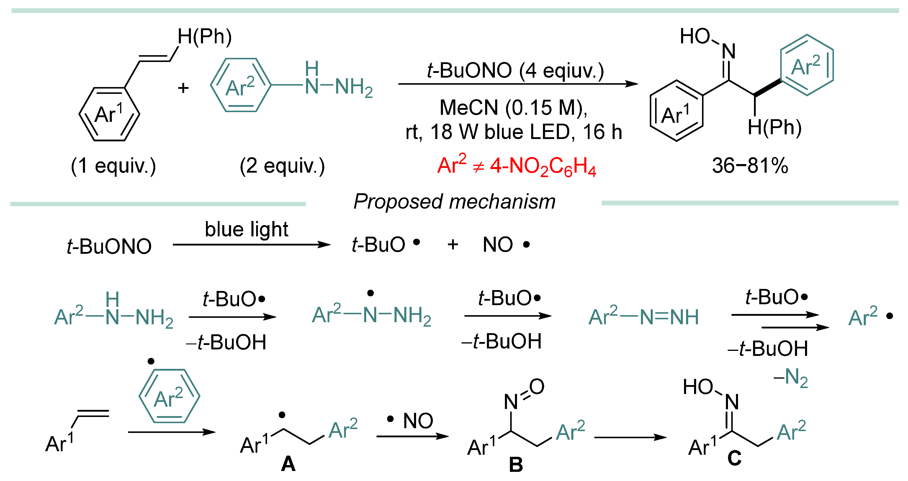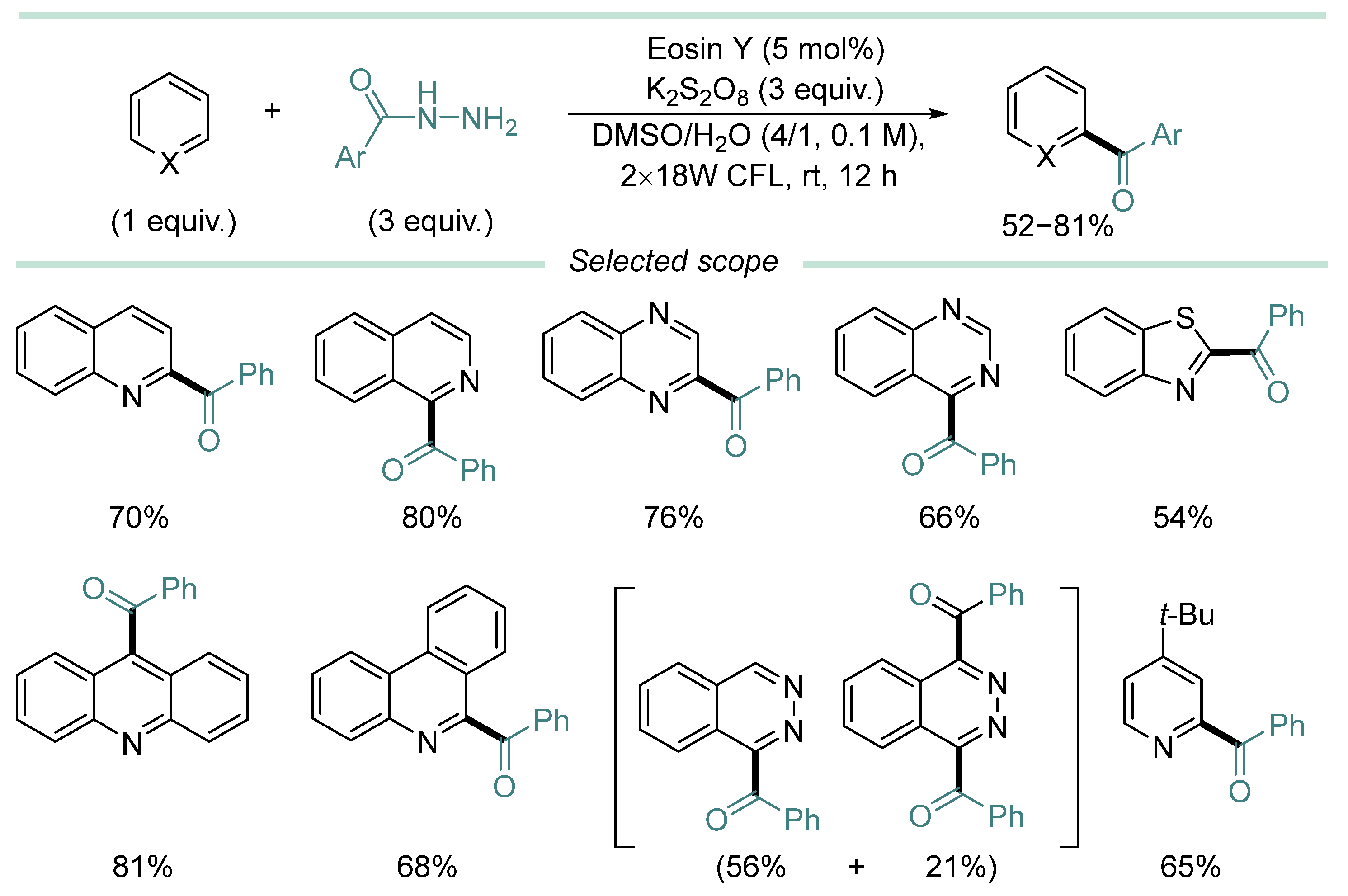 - In most cases, hydrazine derivative is used in excess amounts, in some cases, C-radical acceptor is used in excess, but there are almost no effective examples of C-C coupling with 1:1 substrate/hydrazine ratio, which is a serious limitation when two complex and valuable reagents are to be coupled.