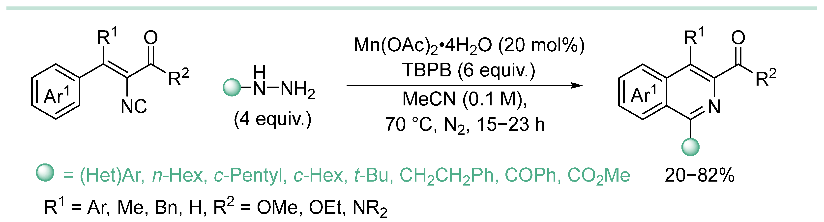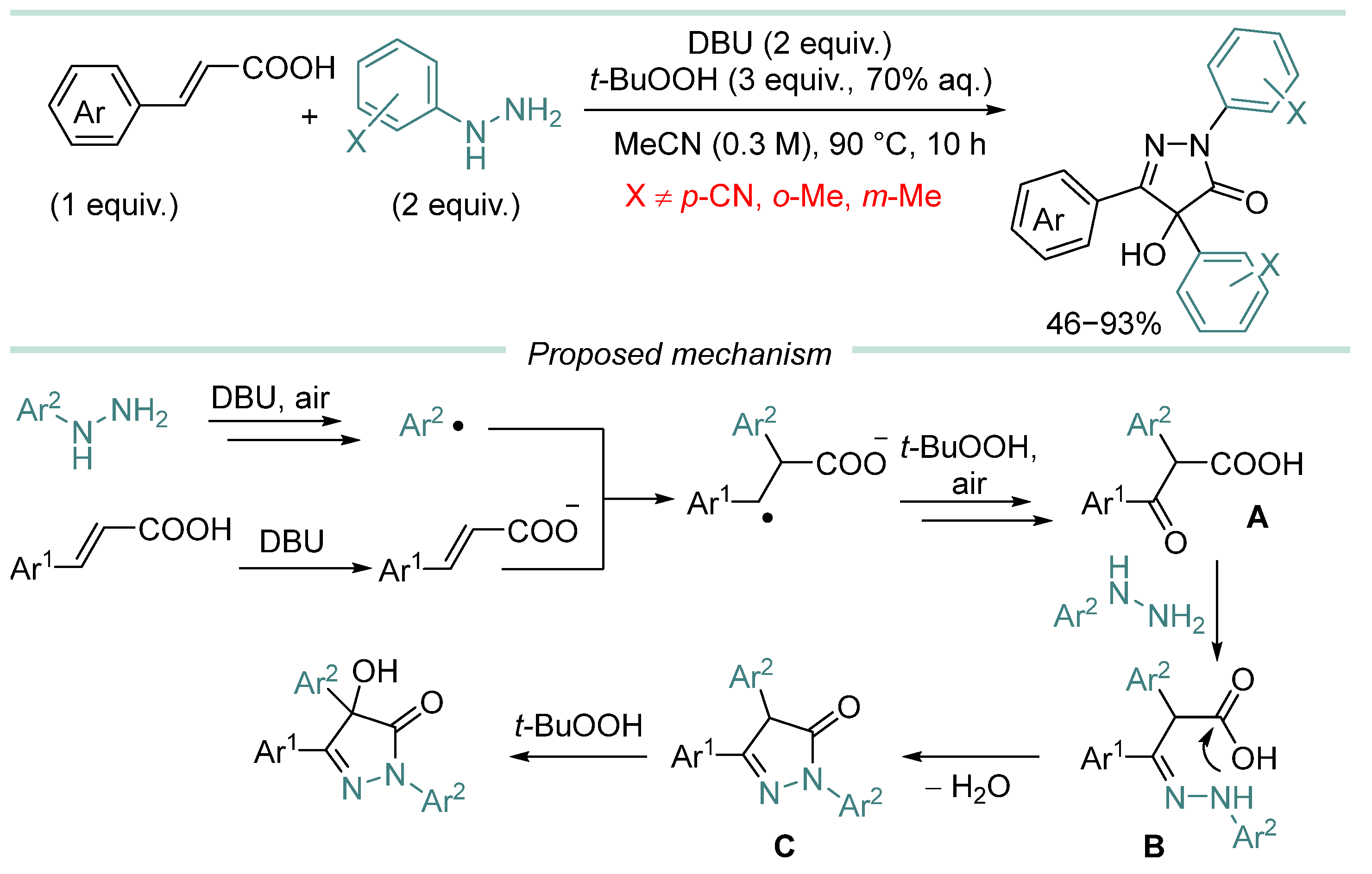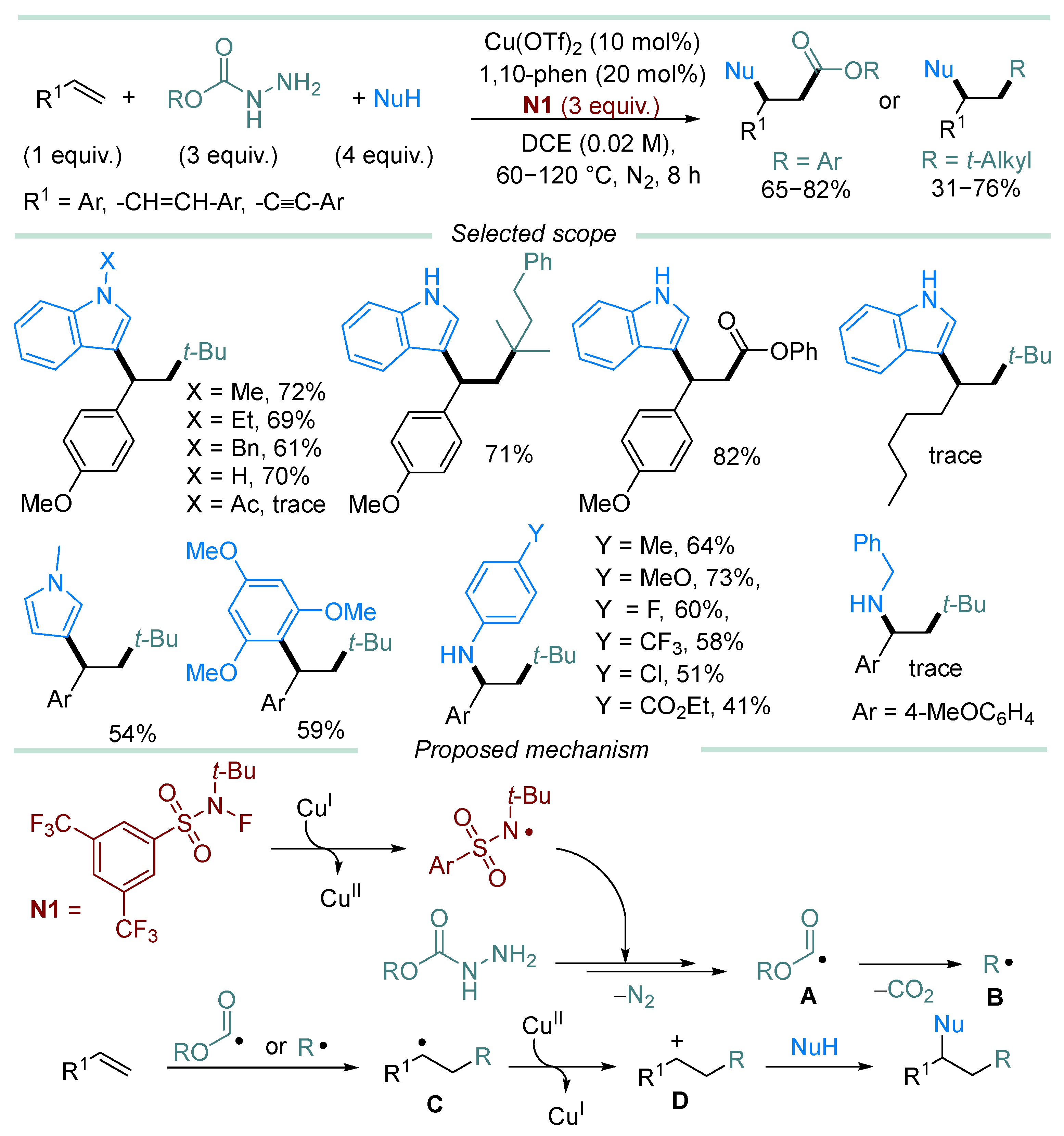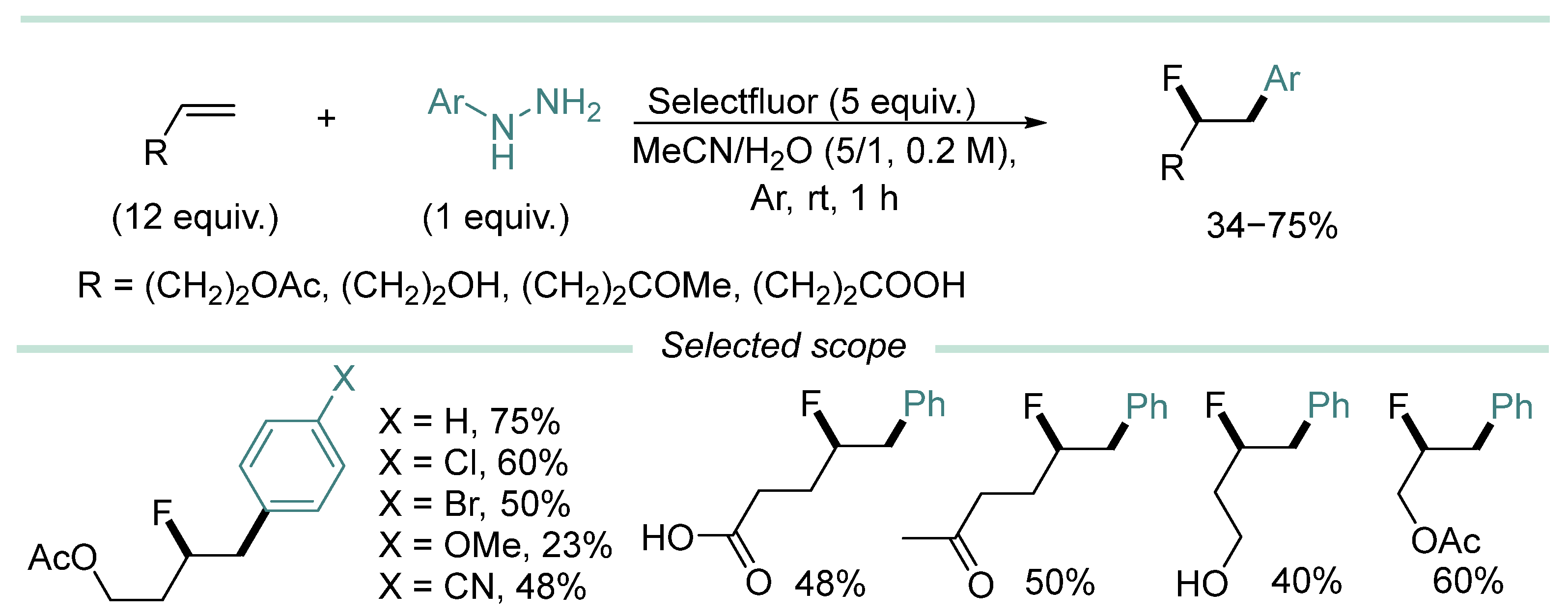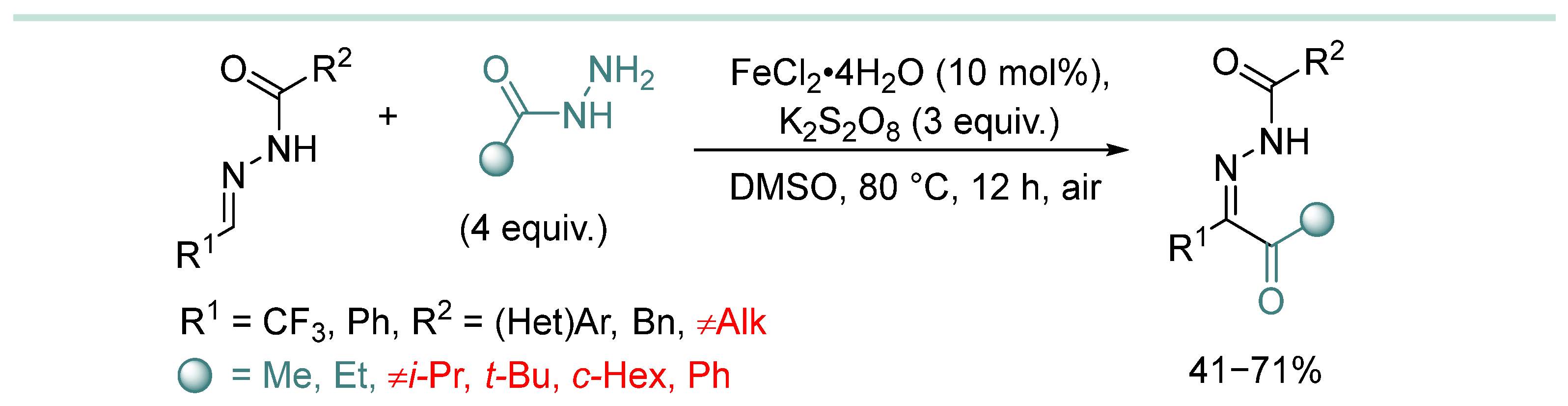 - In most cases, hydrazine derivative is used in excess amounts, in some cases, C-radical acceptor is used in excess, but there are almost no effective examples of C-C coupling with 1:1 substrate/hydrazine ratio, which is a serious limitation when two complex and valuable reagents are to be coupled.