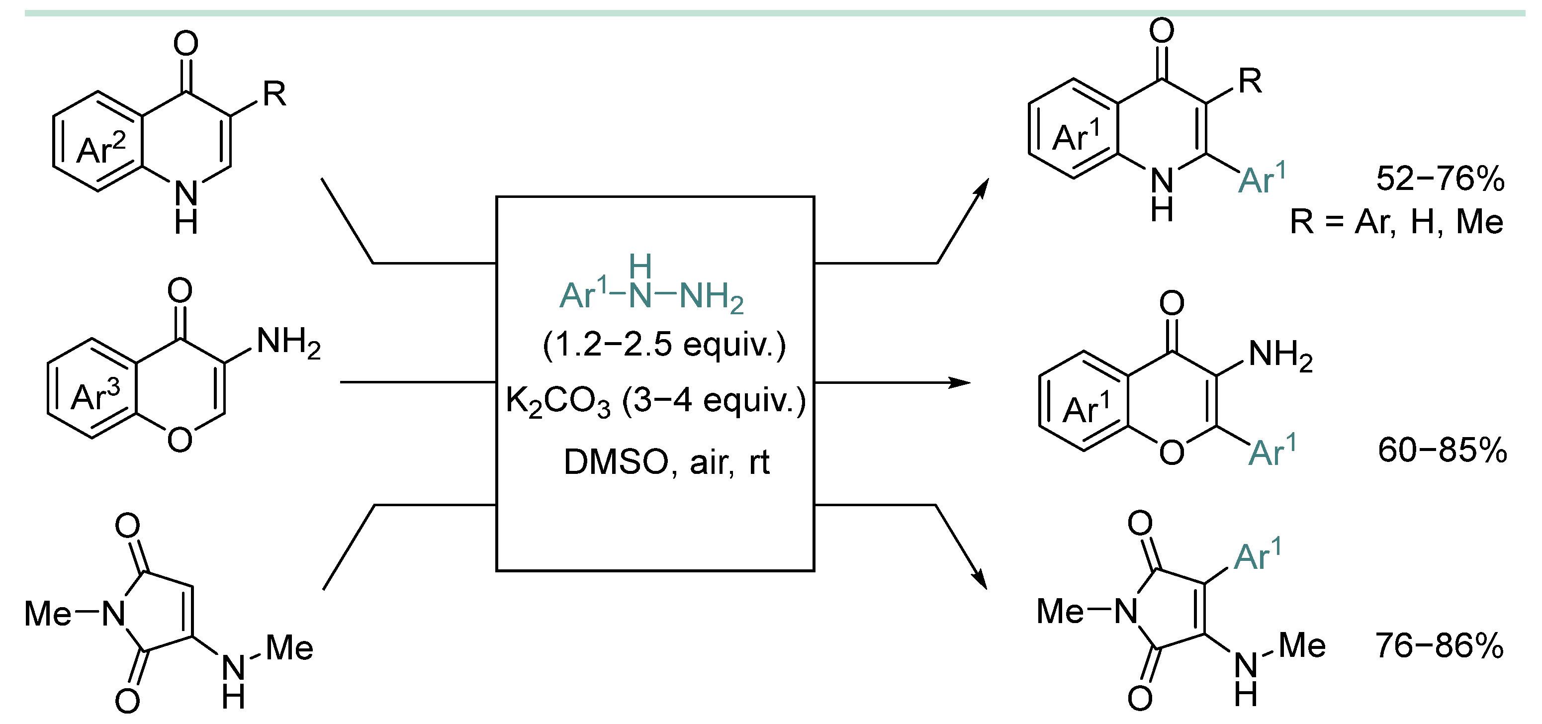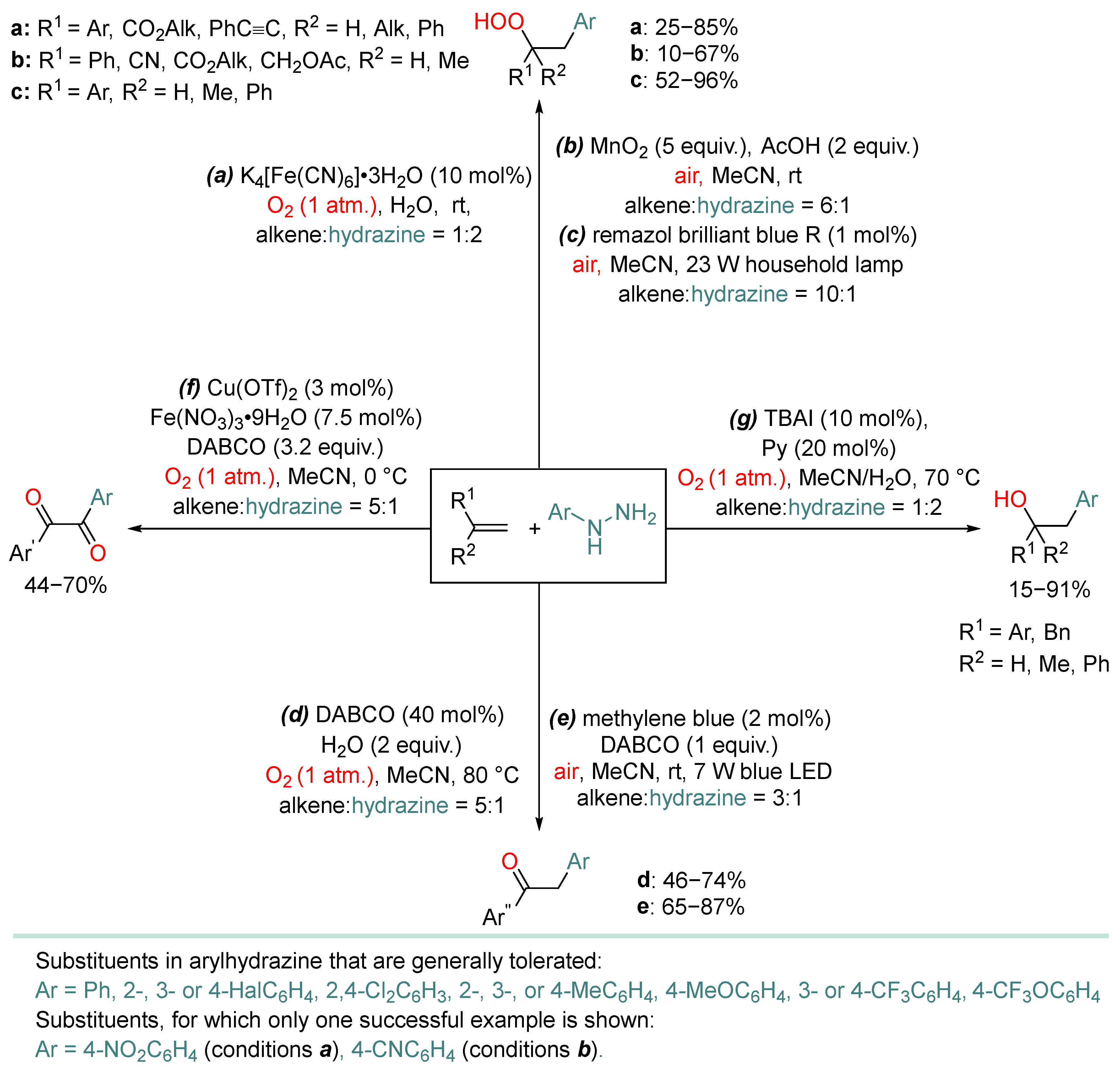 - Despite extensive development of the field, there is no established fundamental understanding of the rational oxidative system choice and prediction of reactivity for various hydrazine types. Apparently, arylhydrazines and alkylhydrazines without electron-withdrawing group are oxidized more easily compared to carbazates and acylhydrazines and, thus, oxidation by air/base systems (see Scheme 1d, Scheme 29, Scheme 32, Scheme 33 and Scheme 39; Table 4, entry 4; Table 5, entry 5; Table 7, entry 1; Table 8, entries 2, 5 and 6) becomes possible without the usage photoredox catalysts, peroxides or transition metal catalysts.