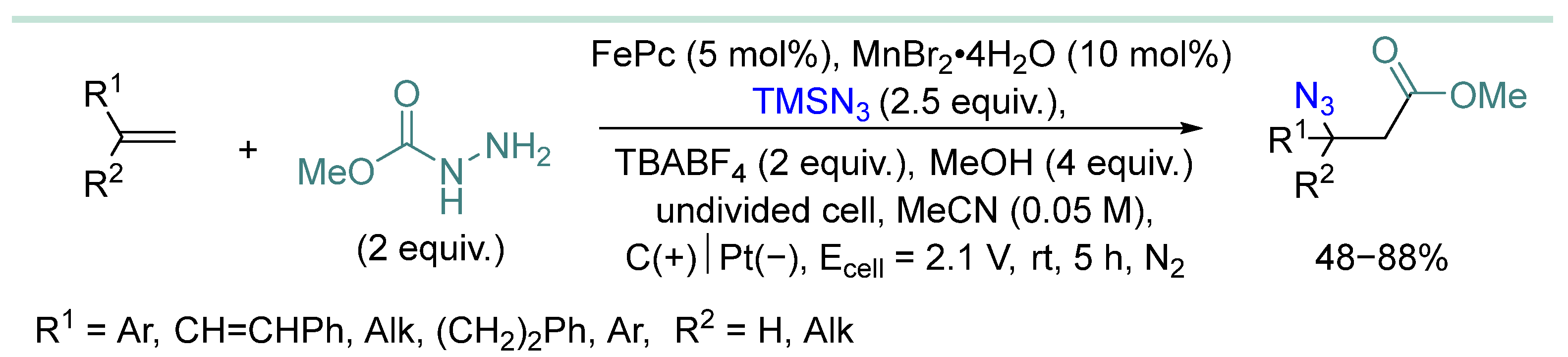 - Zhou, K.; Lv, C.; Fu, N. Electrochemical Metal-Catalyzed Azidoesterification of Alkenes. Eur. J. Org. Chem. 2023, 26, e202200977. [Google Scholar] [CrossRef]