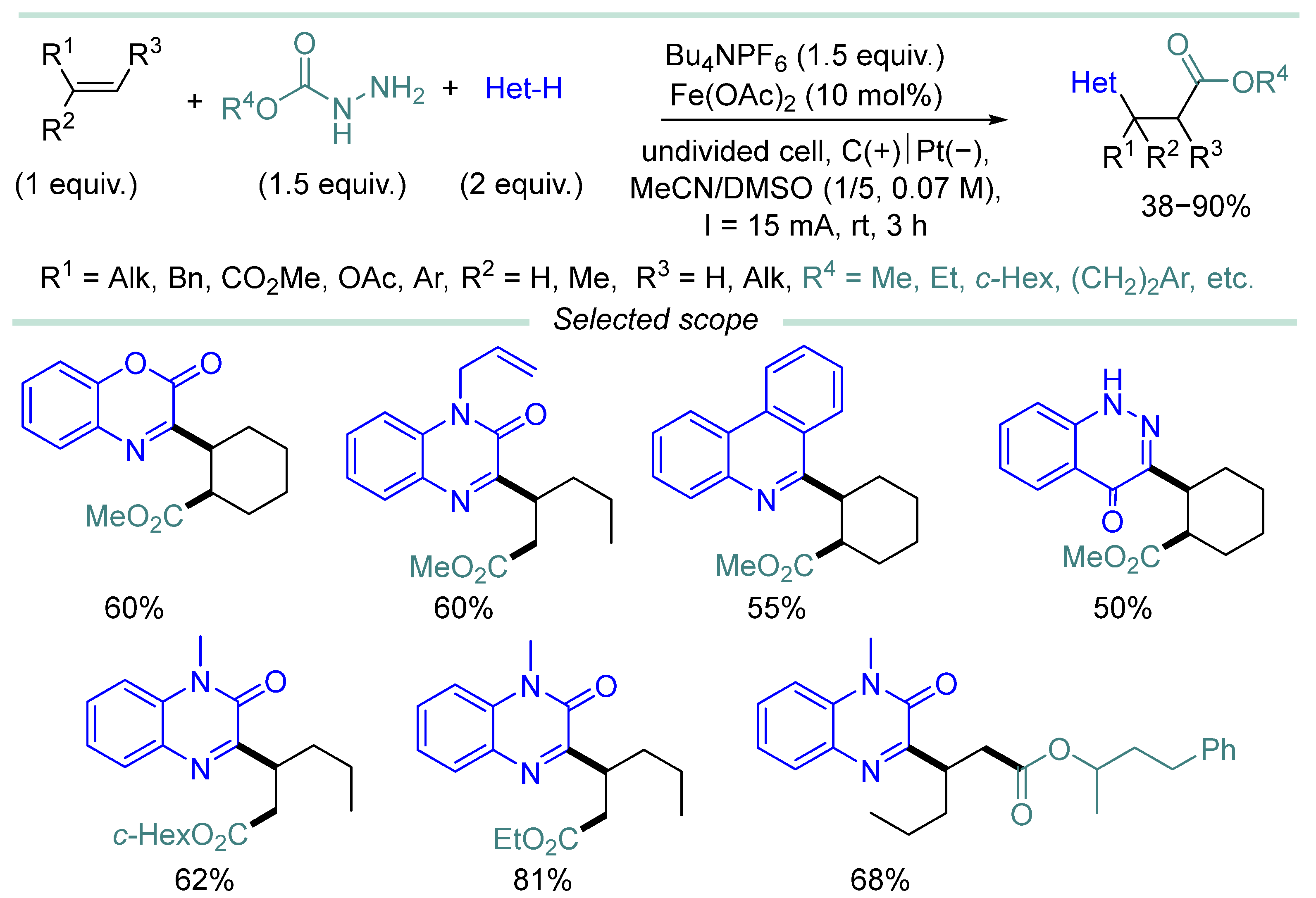 - Gao, Y.; Wu, Z.; Yu, L.; Wang, Y.; Pan, Y. Alkyl Carbazates for Electrochemical Deoxygenative Functionalization of Heteroarenes. Angew. Chem. Int. Engl. 2020, 59, 10859–10863. [Google Scholar] [CrossRef]