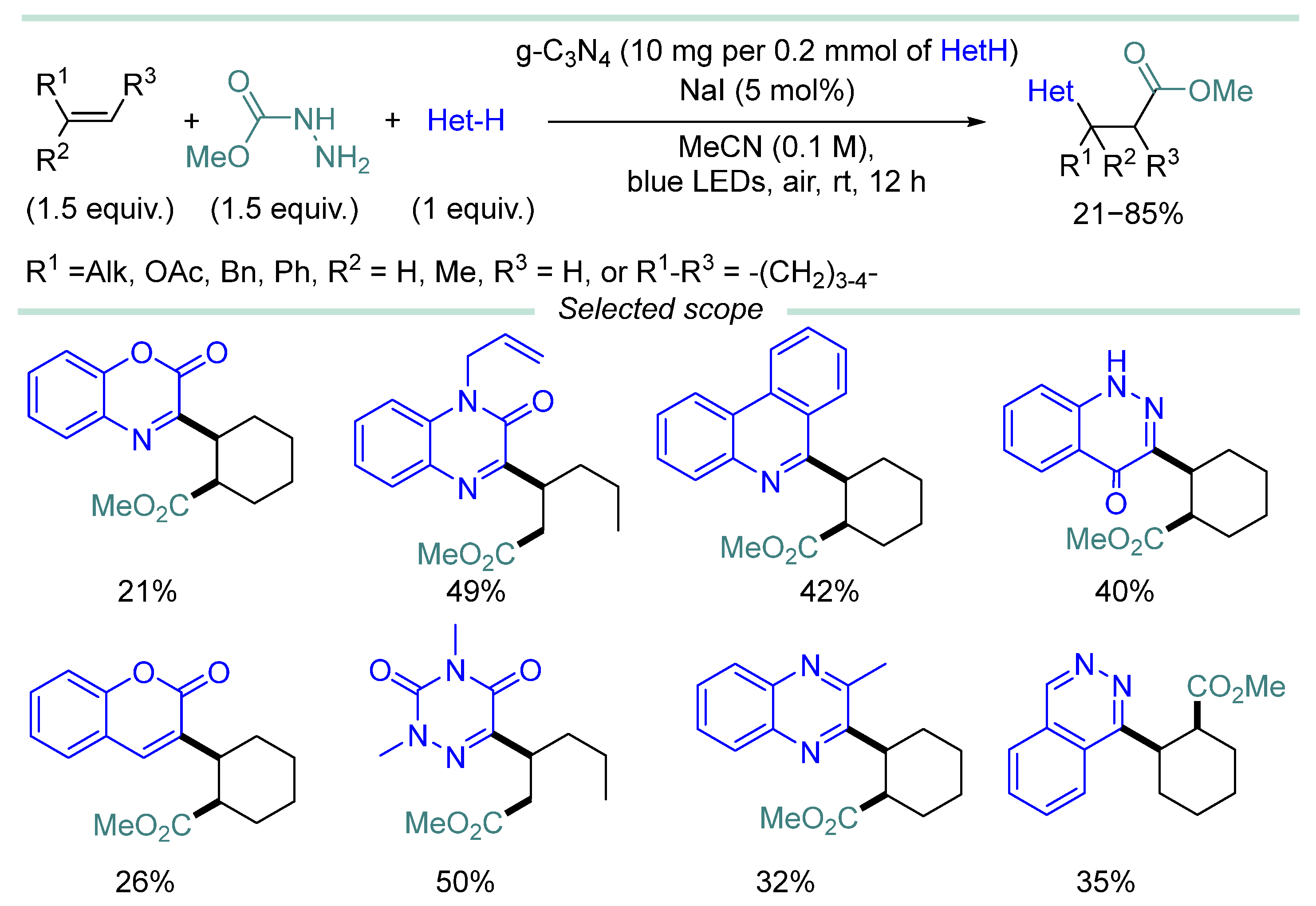 - There is a limited number of examples for radical hydrogen substitution in aliphatic functional groups (compared to heterocycle CH-functionalization) and alkyne functionalization (compared to alkene functionalization).