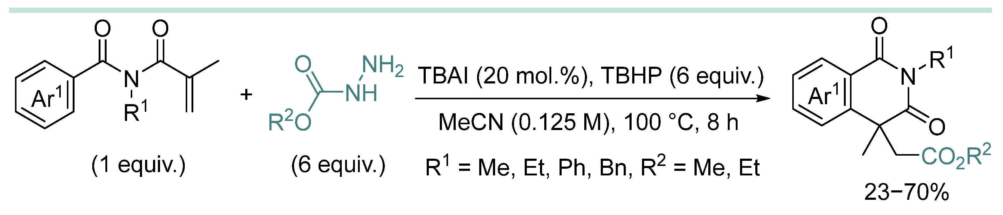 | 3 | CO2Me, CO2Et, ≠CO2Bn | HD (6 equiv.), Bu4NI (20 mol%), TBHP (5 equiv., 70% aq.), MeCN (0.15 M), 80 °C, 6 h. | [89] |